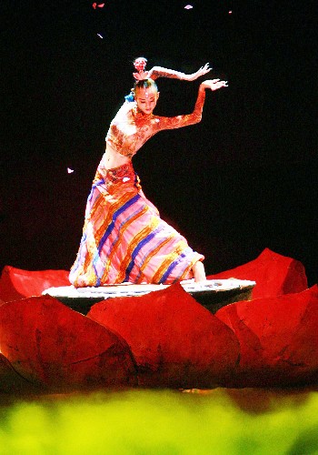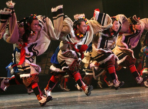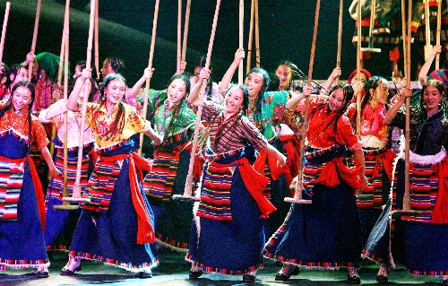 2007年10月6日晚,大型藏族原生态歌舞乐剧《藏谜》在苏州上演。《藏谜》是一部全景式展现藏民族文化的歌舞乐诗篇,几乎涵盖了西藏地区经典的民间歌曲和舞蹈。 新华社发(戚振林 摄)