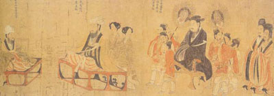 唐代的绘画在隋的基础上有了全面的发展,人物鞍马画取得了非凡的成就,青绿山水与水墨山水先后成熟,花鸟、走兽也作为独立画科引起人们注意,可谓异彩纷呈。初唐时的人物画发展最大,山水画则沿袭隋代的细密作风,花鸟画已经出现个别名家,宗教绘画的世俗化倾向逐渐明显。展子虔的《游春图》尽管悦人眼目,但山水画在中国古代文明鼎盛时期唐代(618-907年)并未成为主流。帝王们一如既往,将绘画作为维护其政治统治和文化权威的工具,宫廷画家仍将他们的主要精力用于肖像画、历史和宗教主题的人物画方面。