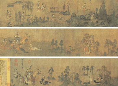 我们从上述帛画中,已初步认识了中国早期绘画艺术以墨线勾勒为主要造型手段、赋之以色彩充填、晕染的样式。顾恺之的绘画,既是对战国以降绘画传统的延续,也是对早期中国绘画形式的总结。唐代美术史家张彦远论述顾恺之的画:“紧劲连绵,循环超息,调格逸易,风趋电疾。”犹如王羲之的书法,出自画家之手的线条除了表现相关的人物和景物,其自身也拥有严谨的结构和丰富的韵律,体现出形式的完美性。顾恺之对仕女、山峦和射猎场面的描绘,似乎完全因袭汉代帛画、画像砖(汉代流行的以阳线或阴线镌刻于砖、石上的绘画,多出土于四川、河南)的概念化表现方法,这一点并形图》传为唐不是说顾恺之缺乏创造力,而表明程式化的表现方法在那个时期已经受到推崇。但此种表现方法,加之山石树木的描绘,限于单线勾勒,画出的人与物比例有失严谨,魏晋时期的山水画也因此呈现着尚嫌稚拙的普遍面貌。作为一代宗师,顾恺之对其所处时代绘画中的优秀元素加以提炼和总结,其作品也因此成为难以企及的典范,引后世画家竞相摹画。从隋、唐两代最重要的画家展子虔、吴道子的画迹上,都可以找到顾恺之画风的影响。 |