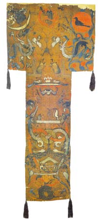 从《龙凤人物图》的发现及其描绘的内容看,作为随葬品是当时绘画的一项重要功能,“绘画艺术”尚未走向自觉。帛画与墓室中常见的另一种随葬物陶俑一样,属于《龙凤人物图》,1949年发掘于湖南长沙陈家大山墓穴的《龙凤人物图》,是巫术用具。对《龙凤人物图》的画面可以有两种解读:其 中的“人物”可能是一名“巫女”,正在为死者祈祷;但画中的妇女也可能是死者,即墓主本人。在这个女性形象的上方有龙、凤,这些古人幻想的、象征“瑞”、“祥”含义的动物形象。龙、凤引导“升天”,正如基督教绘画中的“天使”,将逝者亡灵引向天国。另一幅为画界津津乐道的经典帛画是在长沙马王堆汉墓出土的,大约绘于公元前165年,呈“T”形。考古学家称之为“非衣”,因为它的形状像一件上衣,但并不能穿着。该画以“灵魂升天”为主题,由上而下,描绘了天上、人间、地下的景物,现实和幻想交织在一起。画的中段,即所谓人间部分,呈现的是墓主,据考证为一名叫“利仓”的贵族的妻子生前的生活片段。她身着华丽的锦衣,从体形和拄杖的姿态看已上了年纪,前有仆人跪迎,后有侍女跟随,在大厅中缓步而行。在这部分下方描绘了主人缺席的盛宴:有铺锦缎的食案、鼎、壶、钫等体现贵族身份的餐具和重叠的耳杯等酒具,在场的人不在饮食,而作拱手致敬的姿势,以对主人离席气氛的烘托象征与死者的告别,并祝福死者的灵魂早日升天。汉代人信奉“羽化升仙”,即人死后灵魂升华,成为神仙。画上的天庭,通过日、月、星辰体现,日中有金乌,月中有蟾蜍、玉兔,还有沐浴月光的扶桑树,在天体空隙中穿梭飞腾的应龙。月下一名女子,显然是解脱了尘俗生活的墓主,又回到了年轻和富有活力的状态,身姿矫健地驾御飞龙,在天庭里翱翔,可谓极尽浪漫想象之能事。可以看出,汉代人在自然天体与上述动物之间产生了一种奇异的联想,也因而创造出象征物。这幅富丽而缜密的汉代帛画,继承了我们在《龙凤人物图》中认识的战国时期的绘画传统。