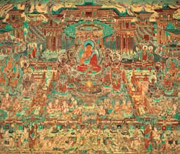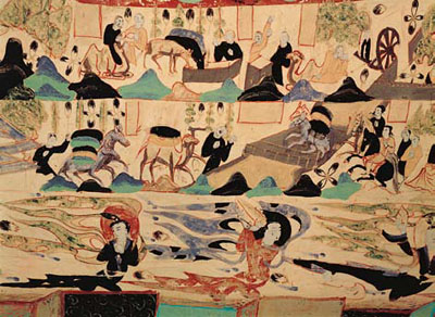 唐人尚享乐、奢华,与早期佛画渲染牺牲、苦修的说教格格不入。莫高窟唐代经变壁画作了变通,如“法华经变”。《法华经》主张彻底得道,但要达到这个目的并不容易,须经过艰苦漫长的修炼。世人多畏惧艰苦,往往半途而废。于是佛以“方便说法”引渡众生。《法华经》用“化城”的故事作隐喻,给信众以启悟。这个故事是说:一群人去远方求宝,要经过漫长的“险难恶道”,大约走了许多路,众人疲惫不堪,而且感到“怖畏”,产生“退还”之念。是时,一位“导师”以方便法化出一城,楼台亭阁、园林流水俱备,众人看到莫不欣慰,便进得城门,但求安稳,以为已经“得度”,不欲前行。导师见状,又将城池化去,并告诫信众,这只是暂时休憩之处,不可就此满足,只有继续发奋前进,才能“共至宝所”。莫高窟第217窟《法华经变之化城喻品》将那座“化城”美妙而生动地展现出来,辅之以画家的想象,勾画出一幅明朗开阔的风景画,画中充满故事叙述的细节。