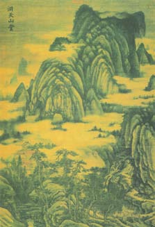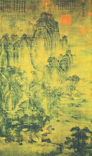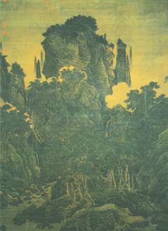 张彦远在《历代名画记·论画山水树石》中有“山水之变始于吴,成于二李”的评论,吴指吴道子;“二李”指唐朝宗室李思训(651-718年)、李昭道(生卒年不详)父子。吴的山水画真迹已无存,二李则有重要作品传世。李思训《江帆楼阁图》画游人在江边的活动,江天空阔,风帆飘渺,山脚丛林中的楼阁庭院和烟水辽阔的江流、帆影,境界广漠幽旷。树的枝干叶络,仍用双勾填色法;山石用中锋硬线勾勒,无明显的皴笔。可见画法沿袭隋朝画家展子虔,但树石景物描绘更为具体,带有写生意味,设色以石青、石绿为主,墨线转折处用金粉提醒,具有交相辉映的强烈效果,保留了展画《游春图》明朗、艳丽的特点。李昭道“变父之势,妙又过之”,所绘《春山行旅图》与《明皇幸蜀图》,均绢本设色,立轴构图,咫尺之间,营造宏大的架构。集云光岚影之变,画深山幽谷白云萦绕,悬崖流泉,古木苍郁,行人策骑游赏,穿行其间,各具姿态,一一被画家收入笔端,曲尽其妙。