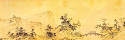 唐与北宋之间的过渡期,史称“五代”(907-956年),尽管短暂,却可能是山水画确立其地位的时期。山水不仅作为修养生息的环境,而且作为“道”的载体而被加以描绘。荆浩和关仝代表的北方山水画派,开创了大山大水的构图,善于描写雄伟壮美的全景式山水;以董源、巨然为代表的江南山水画派,则长于表现平淡天真的江南景色,体现风雨明晦的变化。传统的青绿或金碧山水不再受推崇,笔法和墨法成为文人画家的自觉追求,水墨及水墨淡着色的山水画发展成熟,并显示出哲理化倾向。
