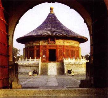 皇穹宇是供奉皇天上帝和皇帝祖先牌位的地方,建筑风格也是以圆形为基调,以宝顶为圆心向外扩展。殿内半拱层层上叠,天花板层层收缩,形成美丽的隆穹圆顶。殿内彩画以青绿为基调,以金龙为主要图案,或描金、或沥粉贴金,显得辉煌华丽,有很高的艺术价值。