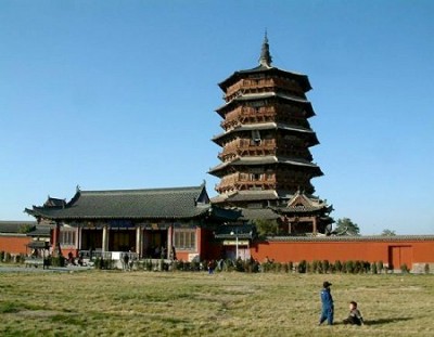 山西应县佛宫寺释迦塔是中国辽代高层木结构佛塔。在山西省应县城内西北隅佛宫寺内。因塔内供释迦佛,故名。又因塔身全是木制构件叠架而成,所以俗称应县木塔。佛宫寺建于辽代,历代重修,现存牌坊、钟鼓楼、大雄宝殿、配殿等均经明清改制,惟辽清宁二年(1056)建造的释迦塔巍然独存,后金明昌二至六年(1191~1195)曾予加固性补修,但原状未变,是世界现存最古老最高大的全木结构高层塔式建筑。1933年中国营造学社对木塔进行考察研究,1935年实地测绘,1962年文物出版社又曾予以补测考察,古建研究专家陈明达编著了《应县木塔》。1961年中华人民共和国国务院公布为全国重点文物保护单位。