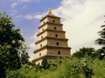 西安慈恩寺塔又名大雁塔,初建于唐永徽三年(652),用于存放高僧玄奘从印度带回的佛经。后倒塌,重建为10层,以后又仅存7层。明万历间(1573~1620)在外壁包砖增厚,但仍基本保存了唐塔的风格。慈恩寺塔为砖建楼阁式塔,平面正方形,现高约64米。下有扁平的台基,塔身逐层内收,形近方锥体。在塔身外壁面用砖逐层砌出仿木结构的有方形壁柱、阑额和栌斗,分各壁为数间:一、二层九间,三、四层七间,五层以上均五间。各层四面正中砌圆券门洞,屋檐以叠涩法砌砖挑出,整体形象稳定而敦实。唐宋佛塔实际上以木塔最多,但木塔不易保存,绝大多数都已破坏,只能从砖建仿木构楼阁式塔略见其风貌。慈恩寺塔只是大致模仿木结构,注重神似,简洁无华,体现了唐代艺术所倾心的豪放壮阔的审美趣味。塔身底层四面券门上的阴线石刻佛殿图及底层南面唐代书法家褚遂良所书《圣教序》碑刻,使这座唐代名塔显得更高的知名度与艺术性。