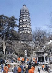 苏州城外虎丘山上的云岩寺塔建于五代吴越国显德六年(959),号称江南第一古塔,为砖砌楼阁式。塔八角七层,约高47米,内部为双层套筒,木梯设在两层套筒之间的回廊里。塔内塔外都用砖模仿木构件详尽地砌出斗拱、挑檐、柱枋、门窗、平座、腰檐和藻井。因地基不均匀下沉,云岩寺塔已经倾斜,与意大利著名的比萨斜塔东西相映,称为东方斜塔。