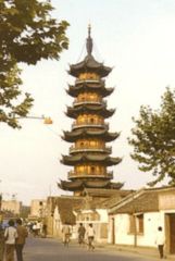 上海龙华塔建于五代吴越末年,相当于北宋太平兴国二年(977),是上海最古老的建筑。塔为楼阁式,七层八角,连塔刹高约40米。龙华塔为砖木混合结构,塔身砖砌,塔檐木结构。中国的佛塔以木塔最多,但木塔不易保存,现存极少。为了保存久远,从北朝开始这种砖身木檐的塔就已出现,外观似乎就是木塔。五代北宋以后江南地区更多,是江南的代表塔型。与山西释迦塔(应县木塔)相比,龙华塔较为细高,塔刹更挺然高举,体型清丽玲珑,秀美可爱,和江南风物非常和谐。其他江南各塔,也大都具有这种特点,是江南艺术地方风格的体现。龙华塔和释迦塔是南北建筑风格两个最典型的代表,同属于中国建筑艺术最优秀作品之列。
