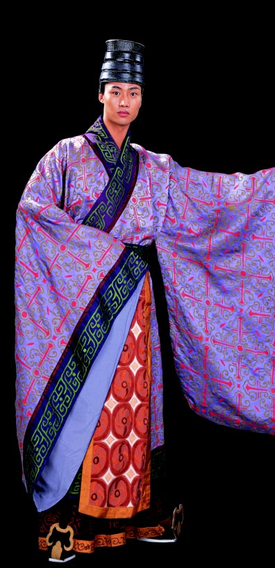 周代的男子服装较为宽松,袖子有宽、窄两式,领子呈矩型。这个时期因为还没出现纽扣,所以一般在腰部系带,并在带子上悬挂玉制的饰物。在穿着者的腹部,还常常佩戴一片上边窄下边宽的斧形装饰布,它原本是用来遮羞的,后来则演化成表示着衣人“决断”的象征物。