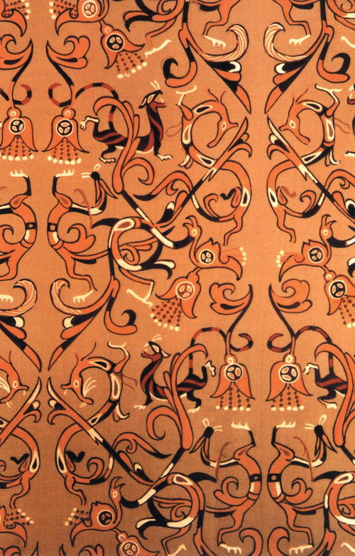 先秦时期的服饰纹样以龙凤、动物、几何纹等为主,具有一定的象征意义。当时最主要使用的是龙凤纹,它既寓意宫廷昌隆,又象征婚姻的美满,而鹤与鹿则象征长寿,猫头鹰寓意胜利……在这些图案当中,常常用写实与变体相结合的穿枝花草、藤蔓纹等穿插其中,使整体纹样生动灵巧,繁而不乱。先秦纹样多以刺锈工艺完成。