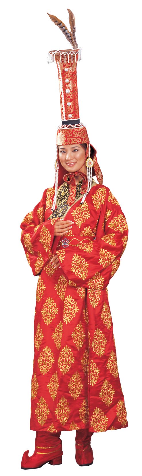 蒙古族女子,时兴戴一种很有特色的“故故冠”。这种冠是用桦树皮或竹子、铁丝之类的材料作为骨架,从头顶向上高约70-100厘米,其顶端扩大成平顶帽形;外面以红绢、金锦或毛毡包裱。