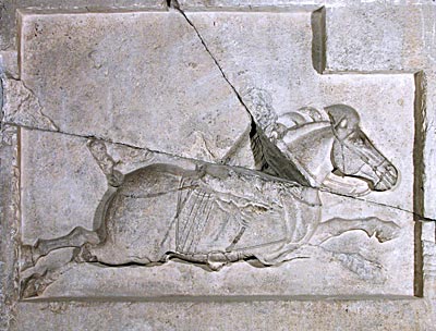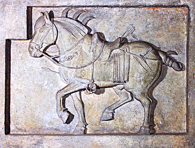 “什伐赤”,“什伐”为波斯语,“马”的意思。毛色纯赤,来自波斯,是李世民与窦建德在虎牢关作战时曾乘骑,身中五箭,可见战斗之激烈。李世民对它的赞语是:“浬涧未静,斧钺申威,朱汉聘足,青旌凯归。”