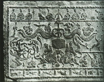 东汉石刻珍品。在山东济宁县两城山石室内,流传于今的有奏乐、舞蹈、杂技等人物活动,以及种种异兽、木连理等雕刻。刻法,先在石的平面,用浮雕刻出人物的轮廓,然后用阴线表现细部形象。作风古朴浑厚,刀法挺劲,具有气势。