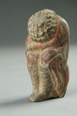 1965年洛阳老城盘龙冢村北魏孝文帝之孙、清河王元怿次子、常山王元邵墓中出土陶俑一百余件,陶质青灰,头和身躯系分别模制插合而成,外表施粉彩,甲胄、服饰涂朱彩。有铠马武士、按剑武士、持盾武士、鼓吹骑士、文吏、侍从、伎乐、奴仆、胡人等形象,反映了鲜卑贵族豪华骄奢的生活。其中出土的一件陶“昆仑奴”蹲坐俑,造型真实,构思奇特,格外耐人寻味。此俑高9.5厘米,并腿蹲坐作蜷缩状,右手抱头,左手横置双膝之上,埋头于两臂之间,仅露满头卷发。著红色衣裤,腰束带,足穿长筒皮靴,生动地刻画了一个异族少年低头掩面,缩成一团的形象,令人看后回味无穷,浮想联翩(现藏洛阳博物馆)。