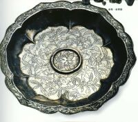 盘作六曲菱花形,圆唇,平折沿,斜壁内收,平底,盘心凸棱内饰莲花纹,其外满錾折枝花卉,平沿上饰折枝花一周,以鱼子纹为地。纹饰清新淡雅,折枝花卉枝繁叶茂,生机盎然。
