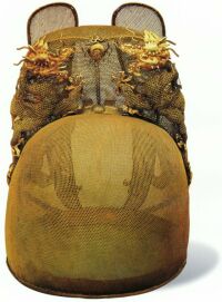 金冠用极细的金丝编成翼兽的形式,装饰两条用同样的金丝编成的金龙,对称装饰在冠顶的两侧,居中是一颗火焰宝珠。