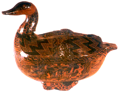 湖北随县擂鼓墩出土。战国早期。此盒形似鸳鸯,木质,空腹,背上有带钮小盖,可开盖注水。首颈与身榫接,可以转动,拔出后,榫眼可作出水口。盒身遍髹黑漆作地,以朱、金两色漆描绘出鸳鸯的外部器官和羽毛,并在腹部两侧绘图画两幅。左腹绘撞钟击磬图,右腹绘鼓舞图。该盒造型逼真,彩绘细腻,漆画感人。