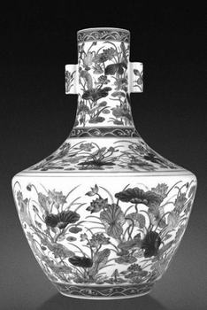 该瓶高43.3厘米,是大清乾隆年制的官窑。瓶直口,长颈,颈两侧有贯耳,折肩,弧腹下敛,圈足。底书“大清乾隆年制”六字三行青花篆书款。口、肩、近足处绘海水纹边饰,颈、耳、肩、腹部皆以斗彩通景绘 《荷花图》。所绘盛开的荷花花瓣饱满,花叶茂盛,表现出乾隆朝画师高超的绘画艺术魅力,并体现了画师对大自然细致入微的观察,把江南水乡美景、盛开的荷花描绘得美轮美奂、赏心悦目,让人流连忘返。