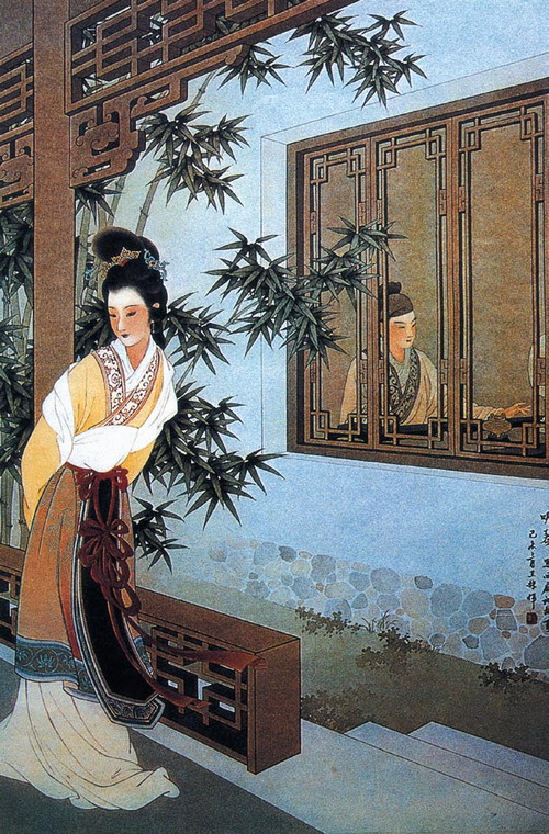 《听琴》,今人王叔晖绘《西厢记》故事。
