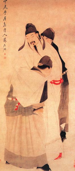 唐玄宗(李隆基)宫殿之内,由内侍二人搀扶侍候的情景。