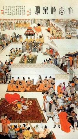 《大唐伎乐图》,今人谢振瓯绘,体现了盛唐时期繁荣开放的时代面貌。