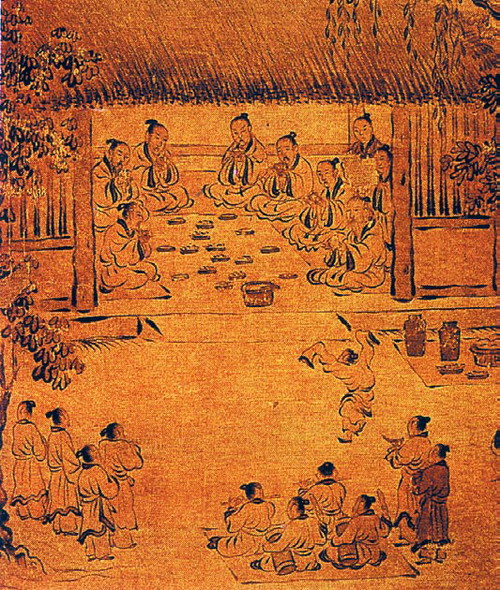 这是为该诗配写的诗意画,表现了年终农闲之际,农人聚在一起的宴饮之乐。