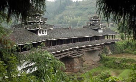 这件事很快传遍了整个侗乡。大家把靠近水面的小木桥改建成空中长廊似的大木桥,还在大桥的四条中柱刻上花龙的图案,祝愿花龙常在。空中长廊式的大木桥建成以后,举行了隆重的庆贺典礼,非常热闹。这时,天空中彩云飘来,形如长龙,霞光万道,众人细看时,正是花龙回来看望大家。因此后人称这种桥为回龙桥。有的地方也叫花桥,又因桥上能避风躲雨,所以又叫风雨桥。