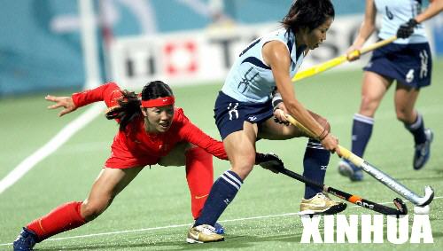 2006年12月13日,中国队球员(左)在比赛中与对手争球。当日,中国队在多哈亚运会女子曲棍球决赛中,以1比0击败日本队卫冕成功。(来源:新华社资料照片)