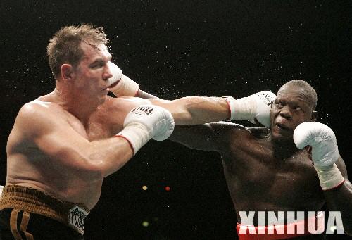 2006年12月10日,俄罗斯拳手马斯卡耶夫(左)在比赛中击中对手。当日,在莫斯科奥林匹克体育馆进行的一场拳王争霸战中,世界拳击理事会重量级拳王马斯卡耶夫击败乌干达挑战者奥赫洛,成功卫冕。 (来源:新华社资料照片)