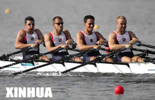 2004年8月22日,在奥运会赛艇男子四人双桨比赛中,俄罗斯队以5分56秒85的成绩夺金,捷克队以5分57秒43获银,乌克兰以5分58秒87摘铜。图为捷克队在比赛中。 (来源:新华社资料照片)
