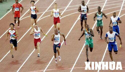 2004年8月28日,在奥运会田径男子4×100米接力赛中,英国队(右一)以38秒07的成绩夺得冠军。 (来源:新华社资料照片)