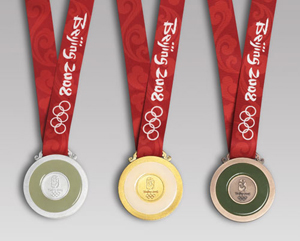 北京2008年奥运会奖牌直径为70毫米,厚6毫米。奖牌正面为国际奥委会统一规定的图案——插上翅膀站立的希腊胜利女神和希腊潘纳辛纳科竞技场。奖牌背面镶嵌着取自中国古代龙纹玉璧造型的玉璧,背面正中的金属图形上镌刻着北京奥运会会徽。
