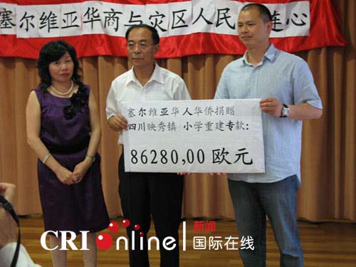 当地时间18日下午,旅塞华商总会和华人和平统一促进会的代表到中国驻塞尔维亚大使馆向李国邦大使转交了86280欧元(合95万人民币)的捐款。华商代表表示,他们对在地震中失去那么多同胞,特别是很多中小学生丧生感到非常痛心。因此他们特意为四川映秀镇中小学校重建捐款,希望孩子们能早日重返学校上课。