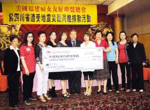 接着,彭克玉来到东方酒楼,与美国福建妇女友好联盟总会的成员会晤,接受207412元的捐款支票。妇女会主席任琦航介绍说,这笔善款其中15000元是该会会员和家人合捐的,其他则是在街头募得。她表示,在上两周,会员不怕劳苦,甚至在风雨交加的天气仍守在募捐箱劝捐,饿了,渴了,也是自掏腰包买饮吃,实在难得,妇女们这种精神,她相信能得到社会的肯定。
