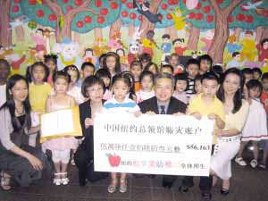 据美国《侨报》报道,6月3日,中国驻纽约总领事彭克玉再到华埠接受客属侨团、妇女组织及幼稚园的抗震救灾捐款。其中,红苹果幼稚园的部分学生更自制了慰问灾区儿童的卡片,彭克玉感动之余,表示要将卡片送到中国去。