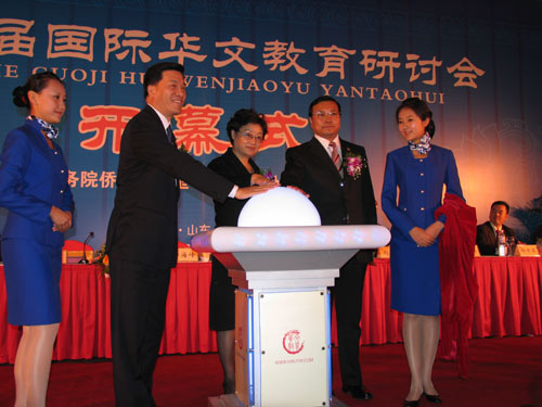 11月4日上午,第五届国际华文教育研讨会开幕之际,由国务院侨务办公室主办的“中国华文教育网(www.hwjyw.com)”隆重推出。国务院侨办主任李海峰、山东省副省长才利民、青岛市市长夏耕等共同点击触摸屏,宣布网站正式开通。(马烨华 摄)