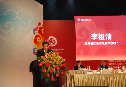 示范学校代表缅甸曼德勒福庆语言电脑学校校长李祖清发言。