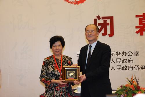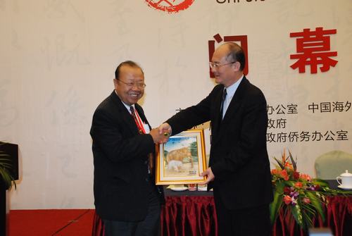 国侨办副主任赵阳接受与会代表赠送礼品